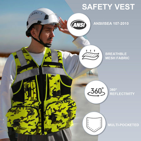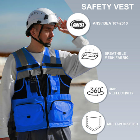Made of 100% polyester fabric and Hi-Vis reflective material, compliant with ANSI/ISEA 107-2020 Class 2 standard. Durable, Breathable, Lightweight and Machine Washable