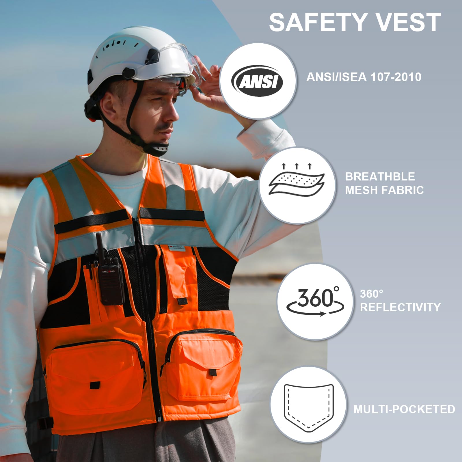 MULTI POCKETS: The safety vest features 10 pockets, including 8 on the front and 2 on the sides, for easy access. In addition to the two top pockets for pens and a 5 x 3-inch phone, the 8 remaining pockets are organized 4 to a side in conventional bilateral symmetry. What sets them apart is their holding capacities and unusually effective layering system with 4 layers of pockets on each side.