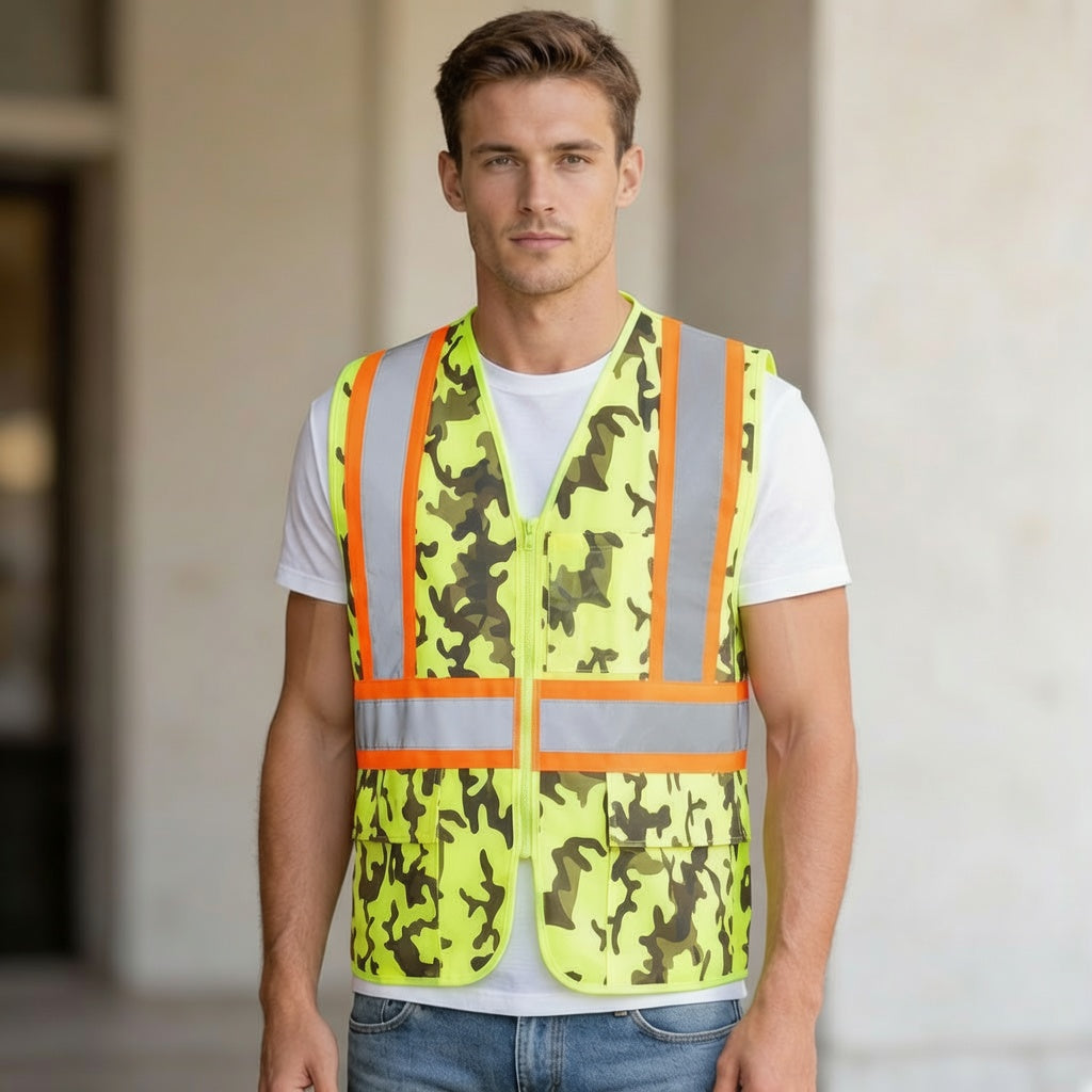 - HIGH VIS VESTS - Durable safety vest for men made of 100% polyester quality woven stitched hi viz neon bright fluorescent reflective vests for adults, yellow/orange safety vest fabric. Reflective safety vest best fitting size & durable zipper closure w/ pull tab. Hi visibility vests w/ two tone contrast stripe offer greater 360 enhanced visibility & mobility night or day.