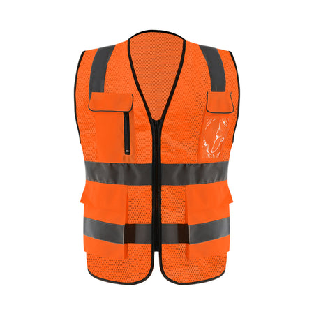 Stay safe and visible with this Class 2 HiVis Viz-Cool Contrast Safety Vest. This industry-leading design ensures that professionals working day or night are seen. This piece of safety apparel, designed to meet the highest safety and durability standards, is ANSI/ISEA 107-2020 Type R, Class 2 compliant, ensuring you feel confident in your protection while on the job. Every detail has been completed precisely, from dual mic tabs to stitched hi-vis reflective tape for added visibility. It also features durable polyester fabric and reinforced pockets, including a left chest transparent ID pocket with a flap and a right chest pencil pocket with a phone pocket. The lower right and left outside pockets, featuring hook-and-loop flaps, provide ample storage space. Available in the strong high visibility colors- Hi-vis Yellow and Hi-vis Orange, which are also imprint-ready. Perfect for companies or individuals needing quality safety apparel with the option of in-house imprinting and personalization.