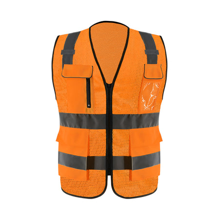 Stay safe and visible with this Class 2 HiVis Viz-Cool Contrast Safety Vest. This industry-leading design ensures that professionals working day or night are seen. This piece of safety apparel, designed to meet the highest safety and durability standards, is ANSI/ISEA 107-2020 Type R, Class 2 compliant, ensuring you feel confident in your protection while on the job. Every detail has been completed precisely, from dual mic tabs to stitched hi-vis reflective tape for added visibility. It also features durable polyester fabric and reinforced pockets, including a left chest transparent ID pocket with a flap and a right chest pencil pocket with a phone pocket. The lower right and left outside pockets, featuring hook-and-loop flaps, provide ample storage space. Available in the strong high visibility colors- Hi-vis Yellow and Hi-vis Orange, which are also imprint-ready. Perfect for companies or individuals needing quality safety apparel with the option of in-house imprinting and personalization.