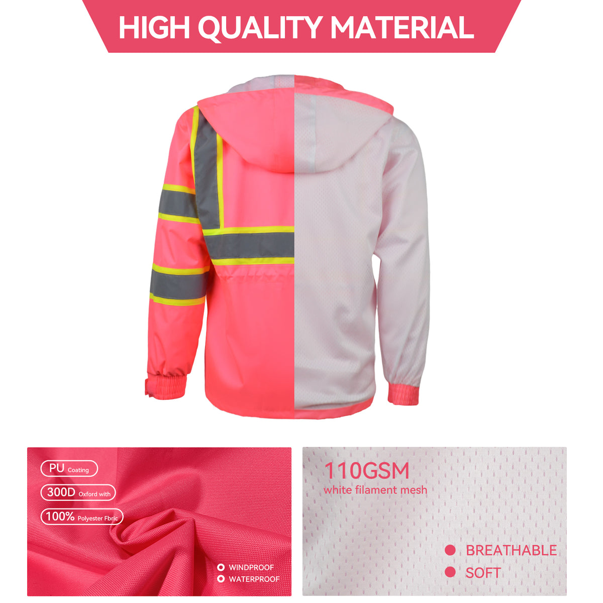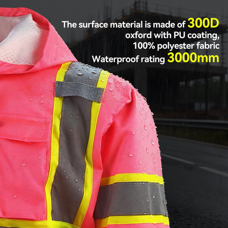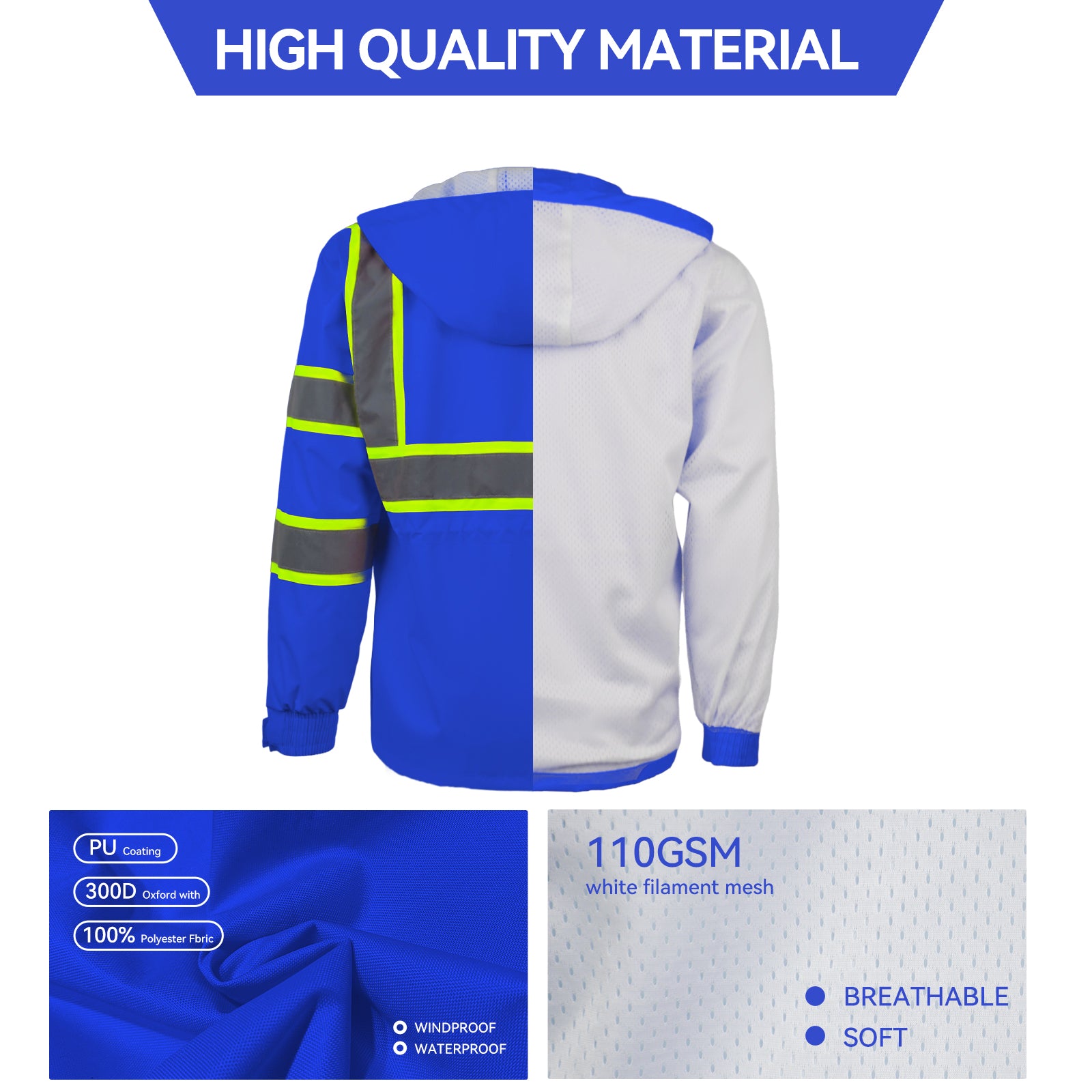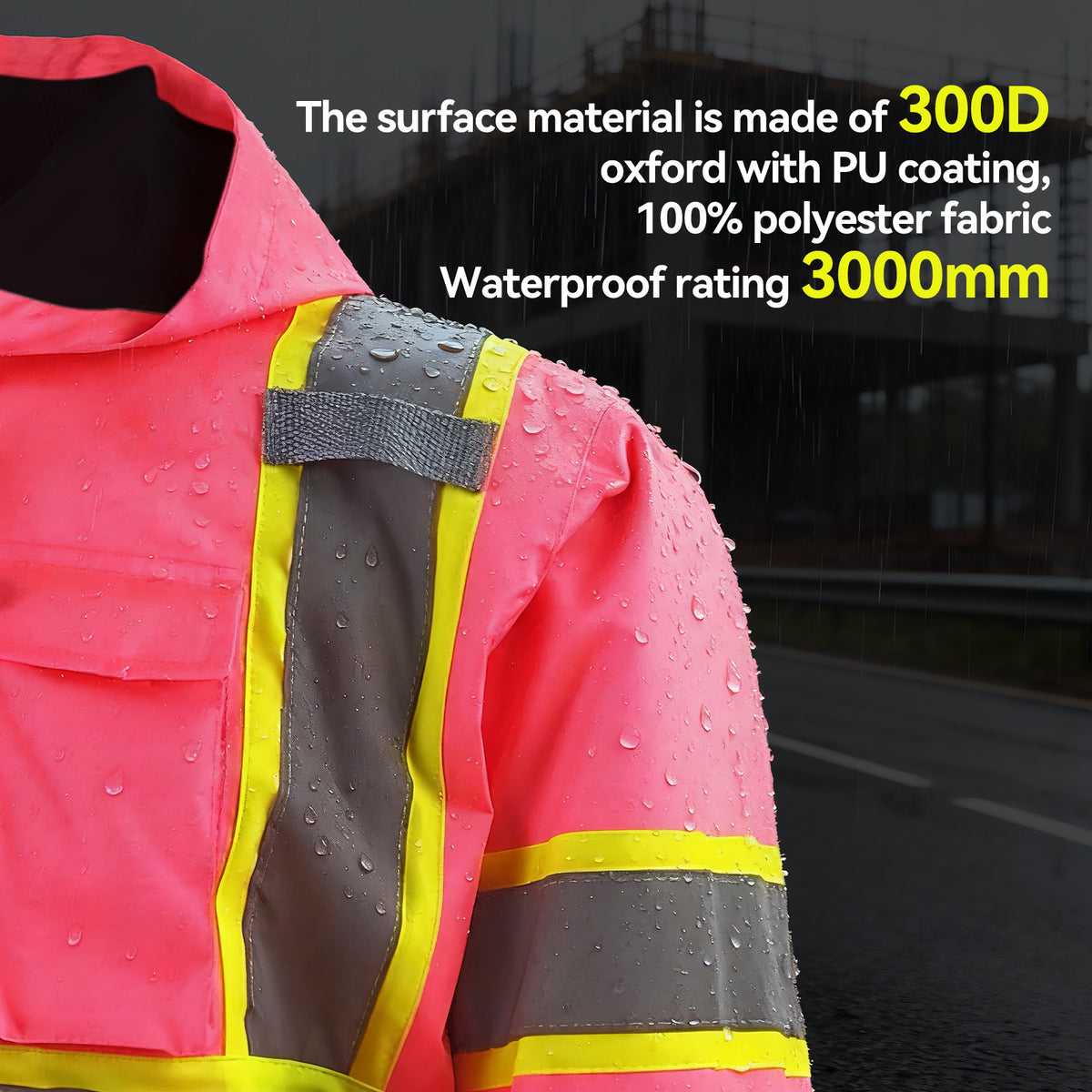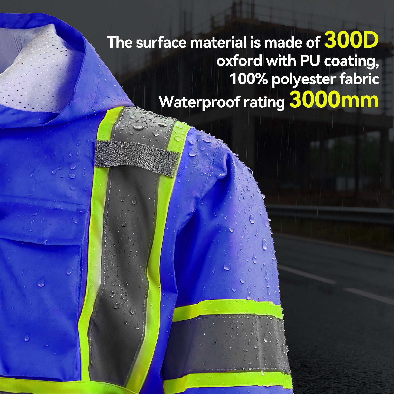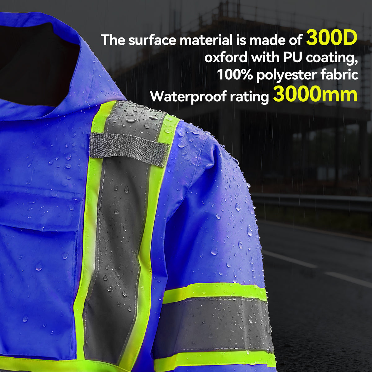 This reflective rain jacket is designed for use in ports, airports, highways, and other high-risk areas. It is ideal for construction workers, truck drivers, traffic police, security personnel and so on.
