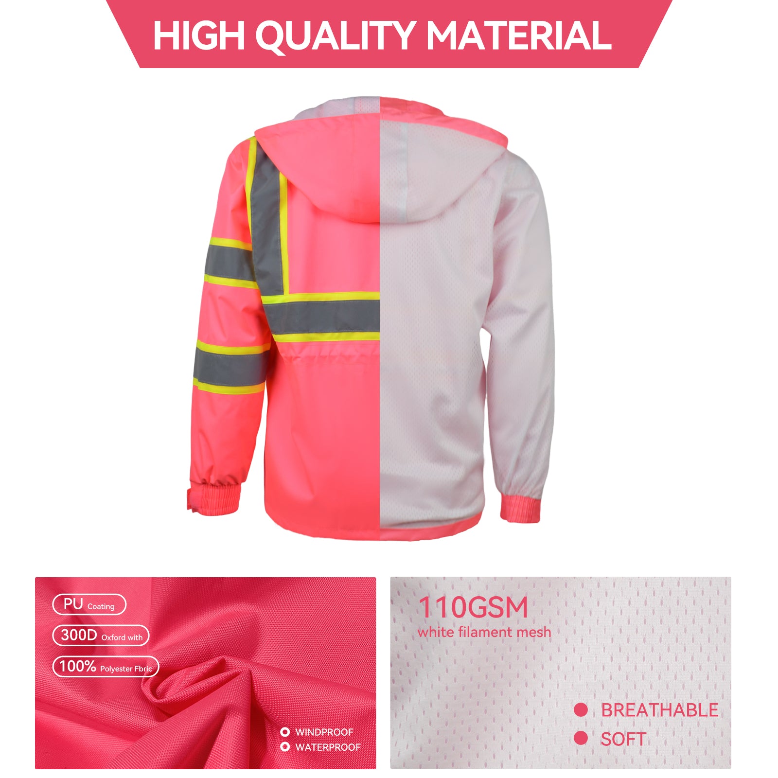 Weatherproof Reflective Jacket: This SMASYS safety jacket is made of lightweight and comfortable 100% polyester fabric, featuring a 3000 mm water column and a 300D Oxford polyester shell with PU coating for enhanced wind and water resistance. At the same time, the safety jackets also have an adjustable drawstring hood to protect our heads and elastic shrinkage cuffs and hem to improve flexibility. Each part of the high-visibility jacket is bartacked, which is firmer and tear-resistant.