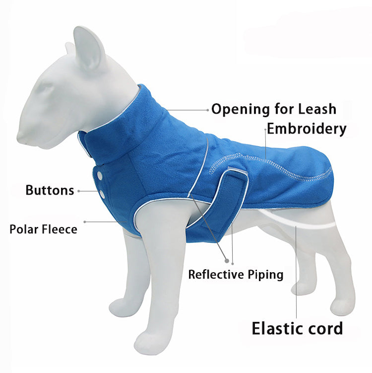 • 100% polyester,made of high quality fabric,waterproof,windproof,with warm fleece inside.Dog jacket comes withe reflective piping for easy visibility at night.